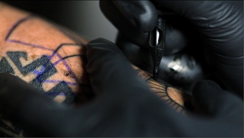 Jak se tetování stroj, a proces umění na kůži v pomalém pohybu. Jehla se pohybuje velmi rychle nahoru a dolů s pomocí elektromagnet, propíchnutí kůže do hloubky asi 1,5 mm a současně umístí malé množství inkoustu.