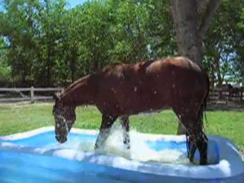 Koňovi stříkající kolem v dětský bazén a pak leží na zemi v něm.