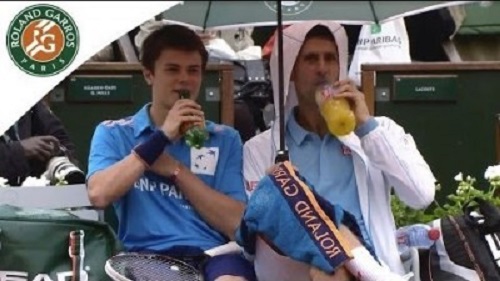 Po druhé přerušení kvůli dešti v prvním kole zápas pro Roland Garros, Srbsky Novak Djokovič znovu krade show přizváním ball boy sedět s ním na lavici. Skvělý tenista diskutuje s mladou a nabídek a občerstvení. Je to sport!