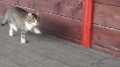 Legrační chůze kočka, která připomíná synchronizované krok parade.
