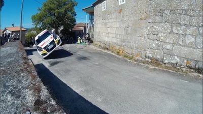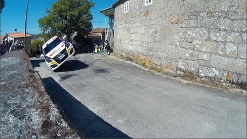 V rally závod 'Ourense Rally' ve Španělsku, Suzuki Swift Barroso a David Oscar Míguez bere prudká zatáčka, balancování na dvou kolech.
