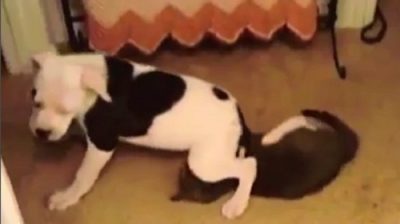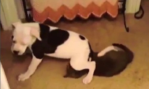 Někteří psi používají originální forma pomsty pro kočky, To je neustále postihují. Technika je jednoduchá, kentraroyn kočka hlavu svými zadky a sedět nad. Ale pozor, protože kolo spinning a kočky mohou platit stejnou měnu psy, Jak vidíme na konci videa.