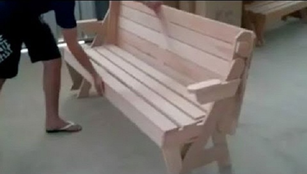 Dřevěná lavička, který transformuje na užitečné tabulky pro zahradu.