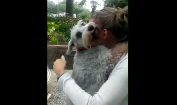 Starší pes 'plakat' radostí z, když člen rodiny se vrací domů po dvou letech. Je tak šťastná, že chvíli ztratí vědomí a rovnováhu.