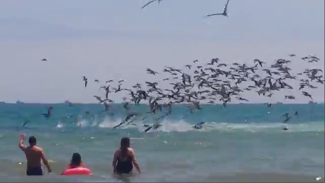 Muž píše hejna pelikánů ponořit se do Tichého oceánu při hledání potravy, jen pár metrů od pláže Crucita, v Ekvádoru.