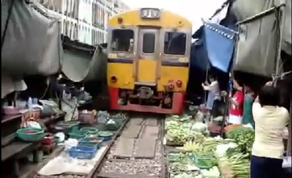 Vlakem z Bangkoku v Thajsku, jezdí 8x denně přes populární město na trhu. Prodejci prostě popadl své stany a jako nic se neděje, pokračovat ve své práci. Můžete vidět zde pěkné video s více detaily.
