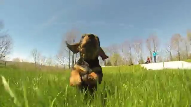 Štěňata rozkošný ntaschoynt spustit na trávě po fotoaparátu.