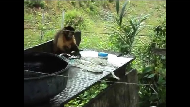 V Brazílii, kapoytsinos hodil v praní. Malá opička napodobuje očividně něco, co zažil, Beating oblečení v lese a pak dunking ve vodě.