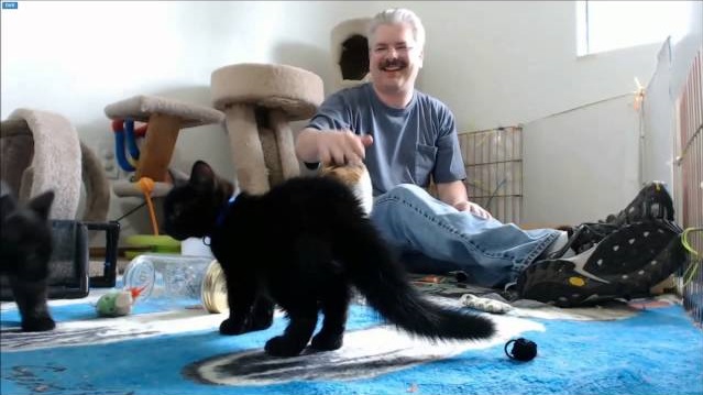Muž se snaží pohladit koťátko, ale nevědomky vyděsit a velkou řetězovou reakci.