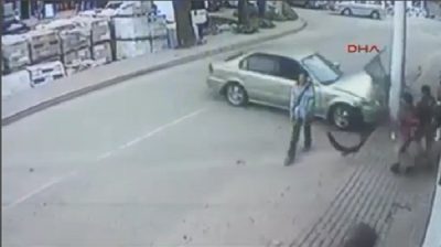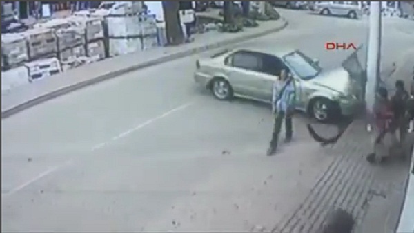 V městě Bursa, Turecko, matka chodí její dvě děti do školy, když řidič ztratí kontrolu nad svým autem, který je zaměřen na vysokou rychlostí směrem k tři chodci. Naštěstí, auto se zastaví u sloupu elektřiny a nikdo se nic nestane.