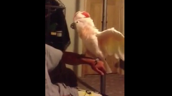 Papoušek s názvem oblázek, zlo se smát a vrtí hlavou zběsile všemi směry, jak sedí v ruce jeho majitel.