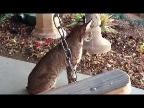 Žena filmů divoký bobcat téměř na minutu před tím, než si uvědomí, že se sedí na verandě houpačka hned vedle něj.