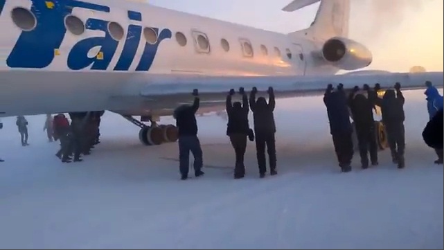 V úterý 25. listopadu na letišti Igarka v Sibiři (Rusko), asi dvacet cestujících Tupolev 134 letecká Katekavia musel tlačit letadlo, Takže si můžete. Poté, co odešel téměř 24 hodin při extrémně nízkých teplotách dosahujících -52 ° C, Letoun byl zajat v ledu, který pronikl dráze, blokováním kol. Remorkér nebyl schopen vytáhnout z letadla, a tak cestujícím pomoci.