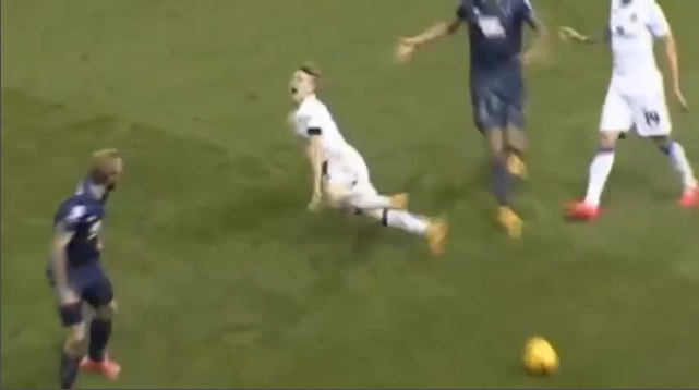 Dramatické herectví giganteblanco Leeds United A.f.c. fotbalista, v zápase proti Derby County v Anglii.