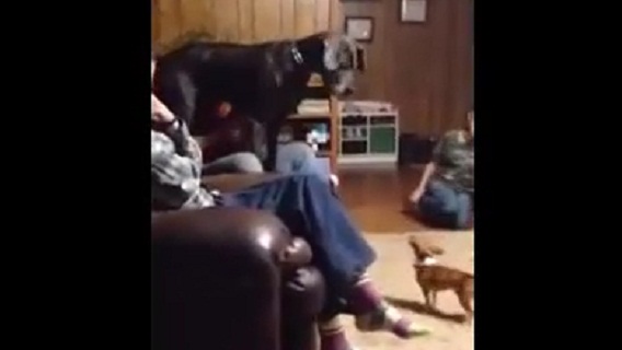 Vévoda, 48 kilový doga se lekne, když uvidí malou čivavu 1,5 kg. Velký pes vypadá strach a přejde zpět na gauči.