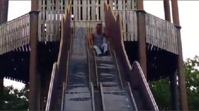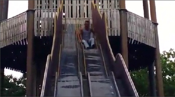 Mladý muž vyleze na velký snímek na hřišti. Sestup bude ale trochu epizodický...