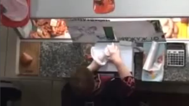 V řeznictví v Rusku, jeden úředník podvádět zákazníka v době vážení masa, Přidání pomocí napínacího závaží na vahách, které zvýšit hodnotu.