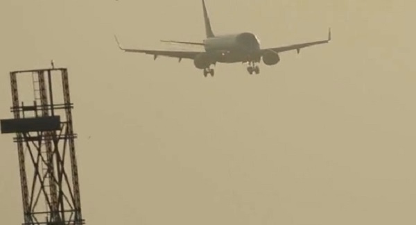 Letadlo se snaží přistát na Leeds Bradford Airport, Anglie, odpočívá na zemi téměř bokem kvůli Větrné Větrná. Pilot letadla Ryanair museli zápasit se silnými větry na podruhé, po další pokus o přistání byla přerušena dříve.