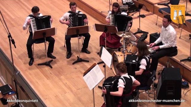 Akordeon orchestr E. V. z Mnichova, hraje píseň „Sandstorm“ od finského DJ Darude s bubeníkem a pěti akordeonisty. Příjemné adaptace.