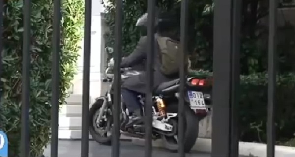 Nebývalý pohled na Maximos mansion, kde vidíme, že ministr financí Jannis Varoufakis listy s jeho motocyklu, Yamaha XJR. Jak si mohli novináři představit, že budou pronásledovat motoristy křičící „pane ministře“.
