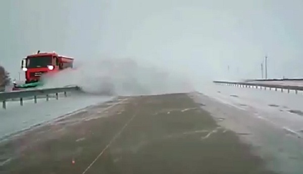 S kamerou na palubní desku auta, Průvodce ukazuje nám, že uvolňuje cestu shild v Kazachstánu. Přístroj vyčistí od špatné straně silnice, a pošle na Nadcházejí sníh.