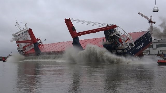 Do první v vody než loděnice Ferus Smit v Německu, Nordana lodi Sky vytváří malou cunami.