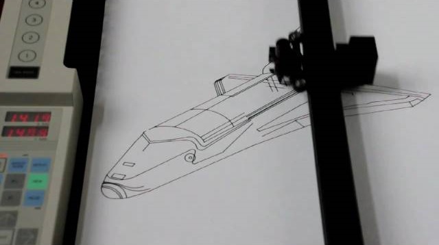 Pera plotru Roland DXY-1300 plány raketoplánu k plánování vytvořené AutoCAD. Roland DXY-1300 je oblíbený plotr vyrobený v 80. letech minulého století pro tisk vektorové grafiky. (Vektor). Tiskne přesunutím pera na povrchu papíru, stejně jako lidská ruka. Počínaje polovinou devadesátých let, pera plotru se postupně nahrazují ve vysokém rozlišení inkoustové a laserové plotru.