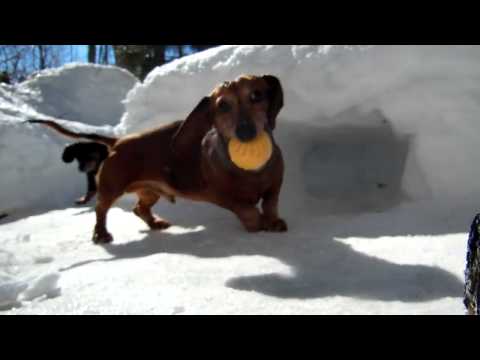 Snaží se trochu pobavit na sněhu, Tento pes majitele a jeho štěňata jezevčík hrát hokej!