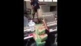 Na staveništi, jako dělník reprodukuje zvuk motocyklu s plechovku sody v ústech a simuluje závod superbiků na velké kolo.