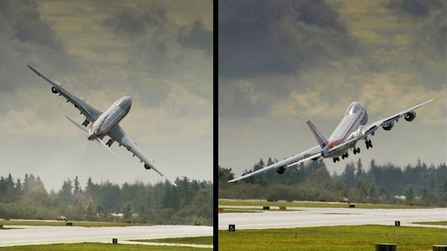 Zcela nový letoun Boeing 747-8 až Cargolux aerolinie provádí bláznivý manévr rozloučení, mával křídly během vzletu na dodávacím letu z Paine Field Airport nedaleko Washingtonu. Všechna velká letadla, aby to 'pozdrav' během dodávacího letu k cíli, ale to pouze tehdy, když vzrostly do výšky 600 metrů a má dostatečnou rychlost. Trik se tradičně provádí jako sbohem na rovině výstavby letiště.