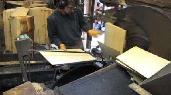 Mladý muž řezané pásy cedru s obzvláště nebezpečný stroj, na pile v Kanadě. Dělník, stojící vedle dvou velkých kotoučové pily: první řezání se provádí automaticky, Zatímco druhý dává požadovanou šířku prkna. Úloha, která vyžaduje příliš mnoho pozornosti.