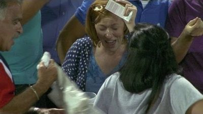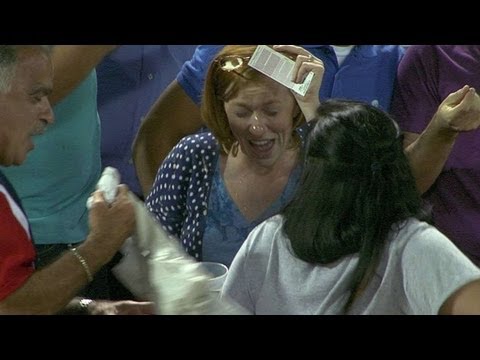 Shane Victorino ’ s úlovek v porostech vede k ventilátoru klepání telefon od jedné ženy a klepání na pivo do tváře jiného.