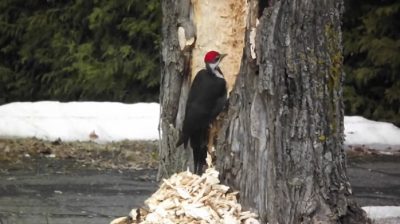 Datel, udělal obrovskou díru ve stromu, z velké hromady pilin ve spodní části kufru. Do Woodpecker obvykle zasáhne dřevo se svým zobákem chytit hmyz, Chcete-li sex volání během období rozmnožování, nebo vybudovat hnízdo.