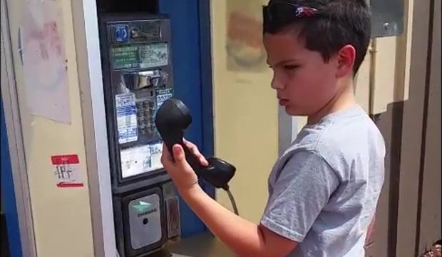 Malý chlapec 8 let objevuje překvapilo telefonní automat, a nechápe, co je. Při pohledu na tajemného objektu po dlouhou dobu, sluchátko se zdá velmi zvláštní a vypadá aporimenos.