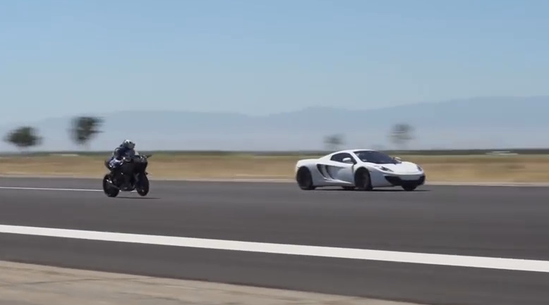 Ninja Kawasaki H2R je jedním z moderních divů světa motocyklu. S přeplňovaným čtyřválcem 1000 ccm a výkonu 300 koní, Je to neuvěřitelně rychlý. Super Street časopis se rozhodli vyzkoušet zrychlení, organizování drag 800 metrů závod proti Bugatti Veyron Super Sport, Nissan GT-R a McLaren MP4 - 12C.