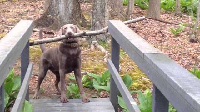 V lese, psí plemeno Braque Výmarské republiky našel dlouhou hůl, nebo spíše větev stromu. Problém však, je, že budete muset projít úzkým mostem s ním v jeho ústech. Po několika sekundách reflexe, Podařilo se mi vyřešit problém bez pomoci, pouhým otočením hlavy.