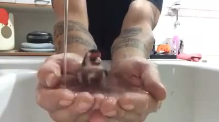 Malý pták koupel v rukou jeho majitele.