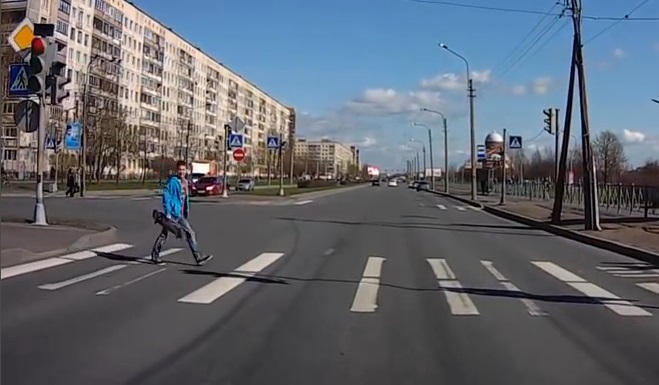 Město Petrohrad v Rusku, mladý muž s skateboard měl velké štěstí. Když začal přes ulici od chodníku, auto projde s červenou a oholí doslova, Zatímco skateboard řez ve dvou!