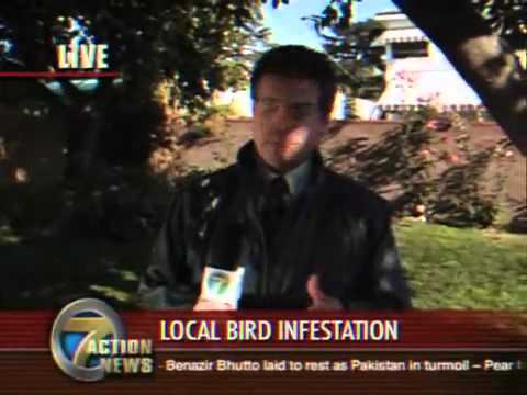 Reportérka dělá příběh o přelidnění pěnkavy v městě v Kanadě, a ptáci začínají být naštvaní...
