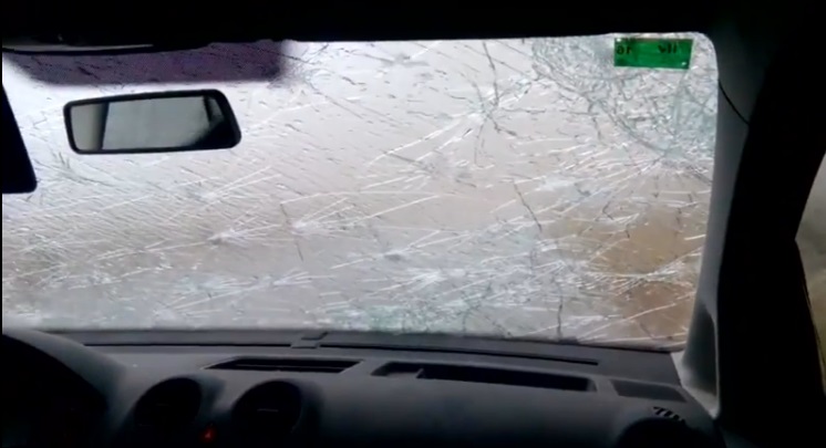Velmi silné krupobití v Čeljabinsk v Rusku zcela ničí sklo auta.