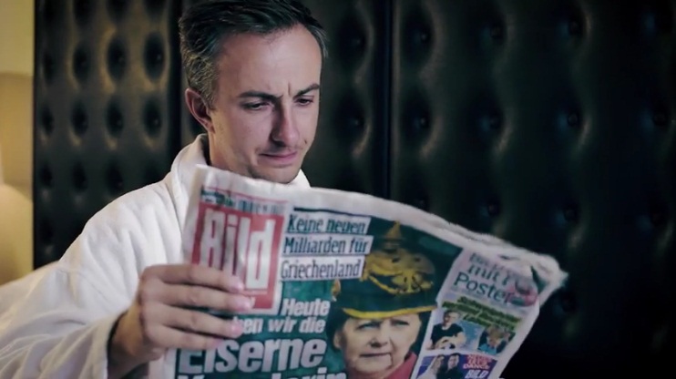 Dva populární německé komici z Neo magazín show a cirkus Royale Halli Galli, satirizovat média v jejich zemi, která útočí v Řecku. Označení různých článek tituly jako součást dialogu mezi dvěma Němci, pozvání na světě pro sjednocenou Evropu.