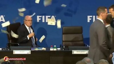 Je to okamžik, že britský komik Lee Nelson létá Paco z poznámek na prezident FIFA Sepp Blatter, s ohledem posměch. V těchto exkluzivní záběry, Když Hotel Blatter vrátí deleasmenos z poznámek, a některé z nich chytne.