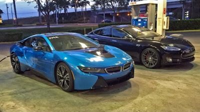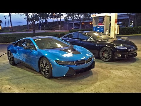 Tesla P85D šílený režim vs BMW i8 táhnout proběhnutí ze zastávky