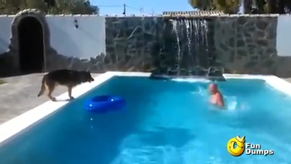 Majitele německého ovčáka předstírat, že neumí plavat a utopil se v bazénu. Pes, jen při pohledu na svého šéfa do nebezpečí, spěchá do vody, aby mu pomohli.