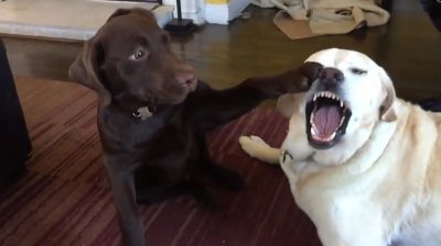 Tři Labrador boj, v zábavné video s použitím slow motion.