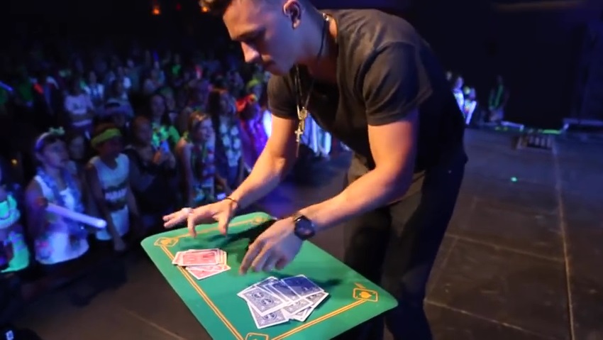Justin Flom, Americký žonglér, nabízí působivý trik, který vzrušuje diváků v live show. Jak zamíchá balíčku, utkání karty s texty několika známých písní.