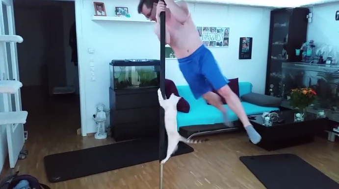 Bengálsko kočka dělá pól taneční soubor se svým šéfem. S mužem se spojil s nohama na svislý posuvník a otáčení.
