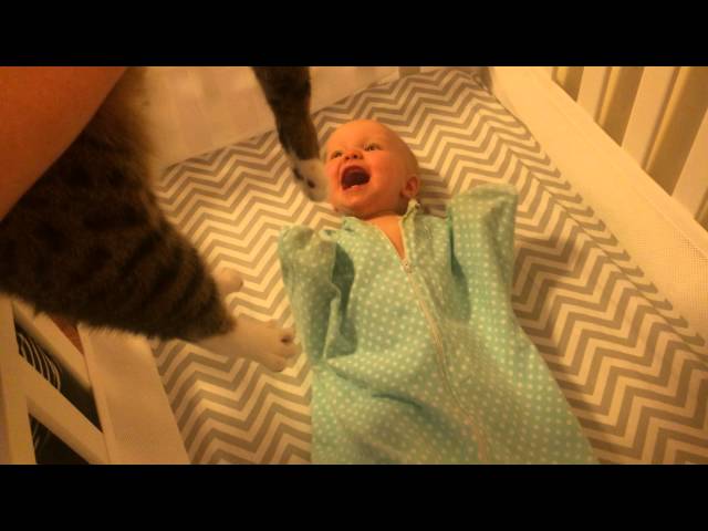 Dítě ležící v postýlce, On taky jednou on vidí jeho kočka dům. Malá holčička potřást rukou a nohou a usmíval se šťastný. Totéž nelze říci pro kočku.