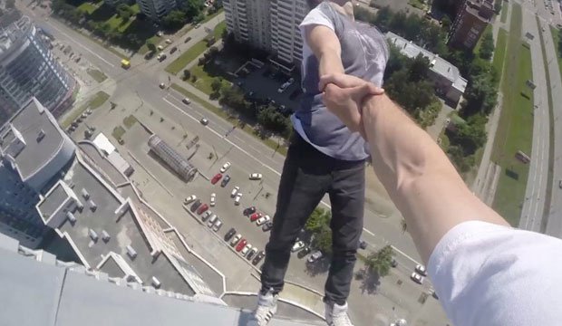 Oleg říká, že má plnou důvěru ve svého přítele a visící z ruky pomocí jako na lůžku. Je fascinující, ale stejně nebezpečná činnost.