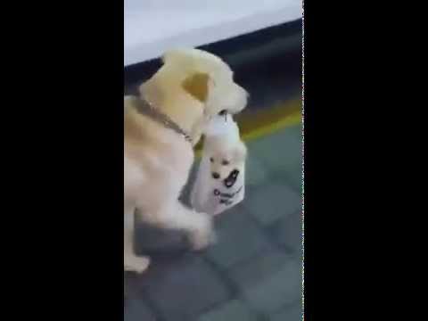 Matka pes nese štěně v plastovém sáčku – roztomilé!